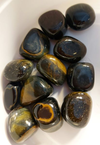 Siniseen taittava ruskeansävyinen tiikerisilmäkivi kooltaan n. 1,5 cm. Tiikerinsilmä-kiven energia lähtee liikkeelle hitaasti, mutta sisältää suurta voimaa. Tiikerinsilmä tasapainottaa ja maadoittaa tunteita sekä auttaa pääsemään yhteyteen oman voiman kanssa. Tuo rohkeutta sekä opettaa oikeaa voiman käyttöä. Tekee hyvää ruoansulatuksen, pernan ja suoliston toimintaan. Ankkuroi käyttäjäänsä paremmin todellisuuteen. Kivet ovat yksilöllisiä ja niiden värisävyt ja kuvioinnit vaihtelevat. Rumpuhionta voi jättää kiven pintaan lievää vaihtelua. Myyntierä on yksi kiviyksilö.