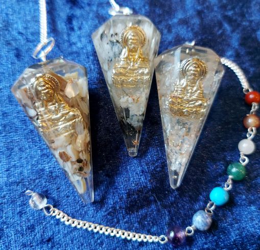 Upea Buddha-koristeinen orgoniittiheiluri vaaleilla kvartsikivillä. Heiluri toimii viestien välittäjänä kysyessäsi opastusta erilaisiin elämänasioihin. Saat mukaan suomenkieliset perusohjeet heilurin käyttämiseen. Heilurikiven korkeus on 4,7 cm ja leveys 1-2,5 cm ja ketjun pituus 15 cm ja siinä on chakrojen värejä edustavat kivihelmet. Orgoniitti eli orgon generator vähentää haitallista säteilyä ja sen toiminta perustuu yhdistelmään, jossa hartsia, metallia sekä kvartsikiviä.
