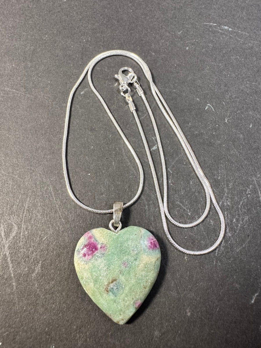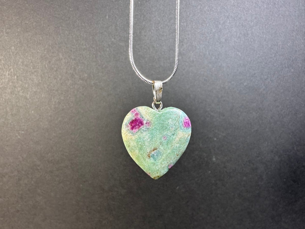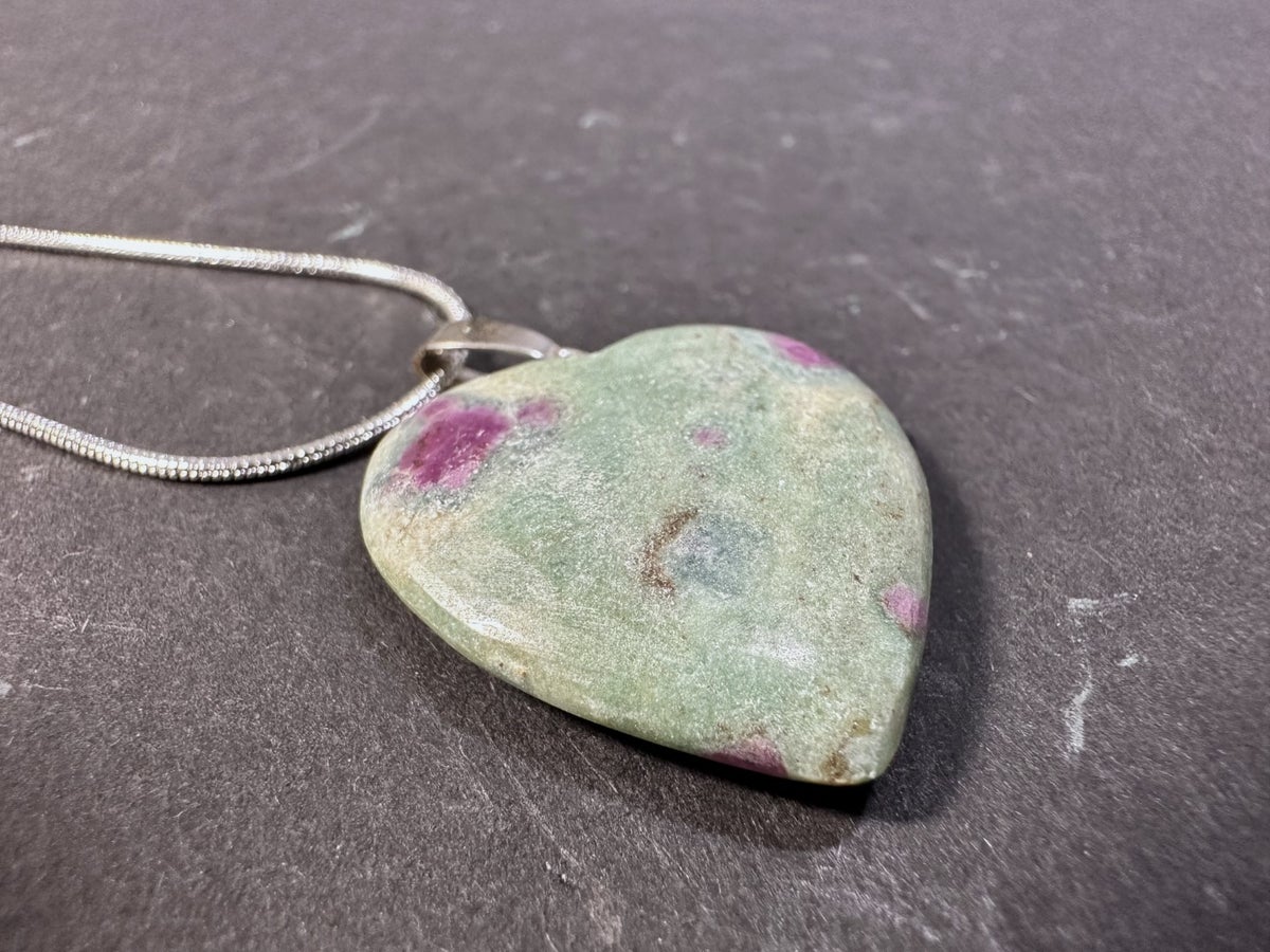 Rubiini-Fuksiitti sydänriipus hopeanvärisessä ketjussa. Rubiini-fuksiittiin yhdistetään mm. ystävät, luottamus omaan viisauteen ja elämään, vapautuminen, vauraus, hyvä olo, yhdentyminen ja rohkeus olla oma itsensä. Kivet ovat yksilöllisiä kuvioiltaan, muodoiltaan, sävyiltään ja pinnoiltaan. Hionnasta on voinut jäädä lievää karheutta tai pintavaihtelua.