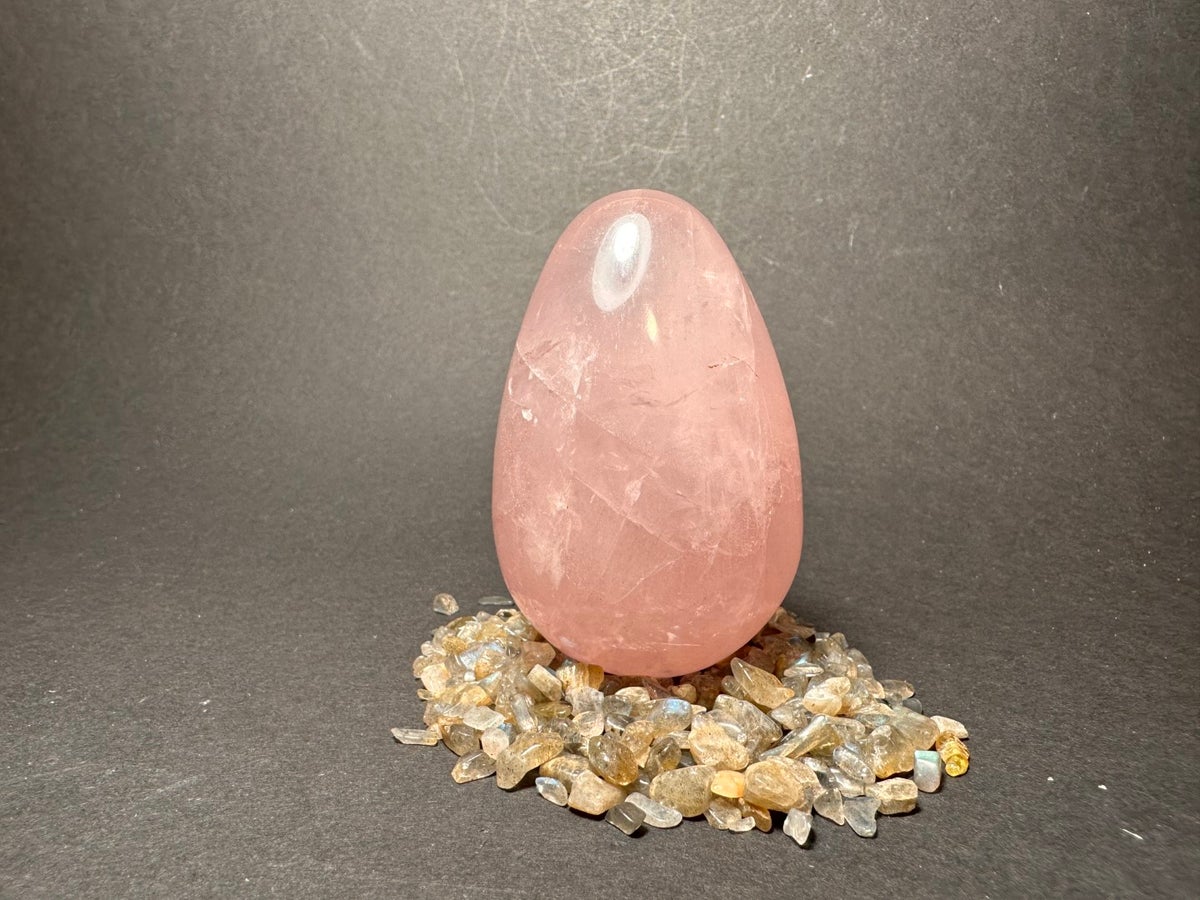 Ruusukvartsista tehty kaunis kivimuna. Munan korkeus n. 6 cm ja halkaisija n. 4 cm, Kivimunat ovat yksilöllisiä, joten niiden koko tai väri voi vähän poiketa kuvasta.