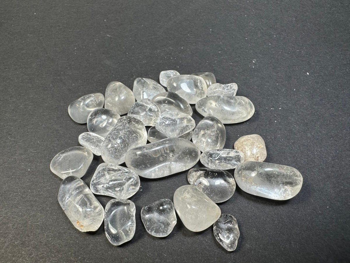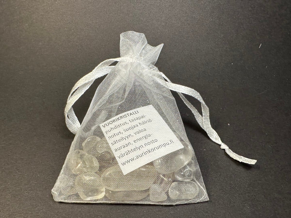 Vuorikristalli rumpuhiottu kivipala. Rumpuhiottuja Vuorikristalli kivipaloja n. 50g pussillinen. Kirkkaat vuorikristallin kivipalat ovat yksilöllisiä muodoiltaan ja sävyiltään. Pussissa olevien kivien koko on 0,5 - 1,5 cm ja ne on pakattu pieneen organzapussiin. Vuorikristalli voi olla jään kirkasta tai siinä voi olla sulkeumia, verhoja, kuplia ja eri värejä. Vuorikristalli tunnetaan myös nimellä kristallikvartsi, universaali kristalli tai kirkas kvartsi.