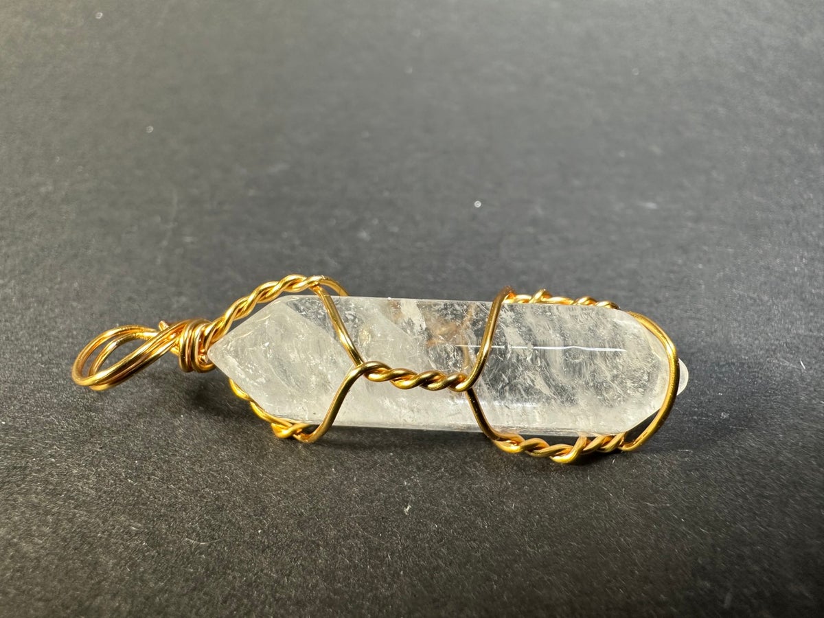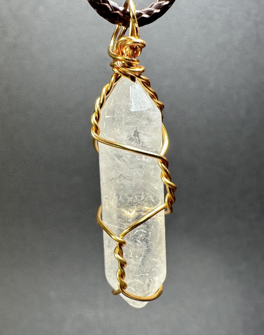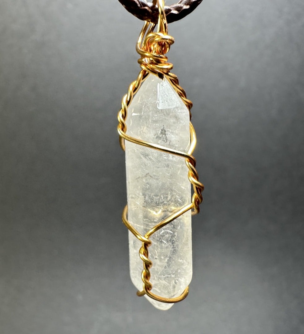 Vuorikristallista tehty kaulakoru. Vuorikristallisauvan pituus on n. 3 cm. Kivet ovat yksilöllisiä muodoiltaan, sävyiltään ja pinnoiltaan.