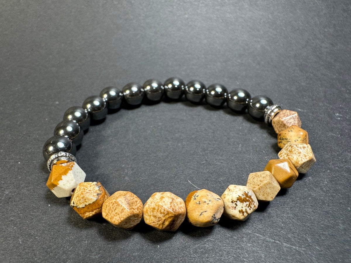 Joustava rannekoru fasetoiduista ruskeasävyisistä maisema jaspis (picture stone) -kivihelmistä. Maisema jaspis on suojaava kivi, joka ohjaa syvempään maayhteyteen (muinaiseen viisauteen). Se vahvistaa mm. keskittymistä, harmoniaa ja vakautta. Rannekorun pituus ilman, että sitä joustetaan on 17 cm, mikä vastaa ranteen kokoa S/M.