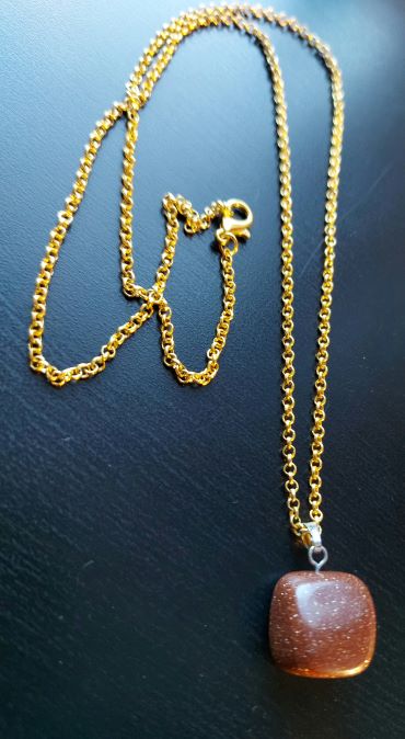 Kuparin/Oranssinruskea, kiiltäväpintaisesta Goldstone eli Kultakivestä tehty kaulakoru. Goldstonen vaikutusalue on erityisesti sakraalichakra. Kivi vahvistaa olemukseen lisää iloa, onnea, rohkeutta ja valoa. Goldstone-kivi on synteettinen lasisekoitus, jossa on kiiltävää kuparihiekkaa. Riipuskiven koko on n. 1,5 x 1,5 cm. Mukaan tulee lukollinen, kullanvärinen nikkelitön kaulaketju pituudeltaan 60 cm. Ks. myös vaihtokaulanauhat. Voit halutessasi laittaa lisätietoihin toiveen hopeanvärisestä vastaavasta ketjusta, joka vaihdetaan siihen samaan hintaan mikäli ketjuja varastossa on!